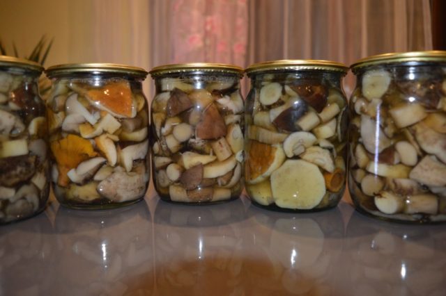 Houby se promyjí a umístí do smaltované nádoby se slanou vroucí vodou po dobu 15-20 minut. Pak jsou hozeni do cedníku a naloženi zpět do hrnce. Nalijte připravenou marinádu a vařte 30 minut. Poté se houbová hmota vyjme štěrbinovou lžící, ochladí se, položí se na dobře umyté nádoby a pevně se uzavře víčky nahoře.