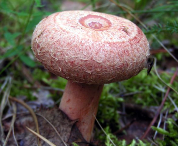 - Průměr čepice takové houby je od 5 do 10 cm. Existují velké vzorky až do velikosti 15 cm. Na růžovo-červeném povrchu jsou jasně viditelné tmavé soustředné zóny připomínající kruhy na vodě. Jsou tvořeny hrubými klky. S věkem kruhy ztrácejí jasnost. Tvar čepice mladé houby je konvexní. Postupně se stává plochý, s mírným prohloubením ve středu a klesajícími okraji.