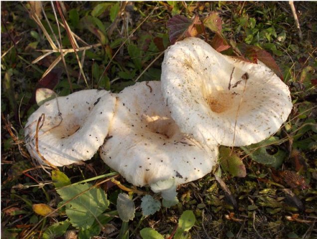 - Klobouk o průměru ne více než 10 - 12 cm má bílou barvu a vypadá, že je špinavý. Jeho odstín, v závislosti na místě růstu, se může mírně lišit: být světlejší nebo tmavší. Konvexní povrch je pokryt klky, které tvoří soustředné zóny. Kvůli bledým nebo nažloutlým klkům nejsou kruhy na čepici tak jasné jako u růžové odrůdy. Ve středu víčka je zaoblená žlutá prohlubeň. S věkem se stává trychtýřovitým.