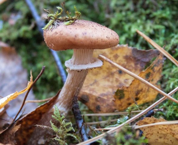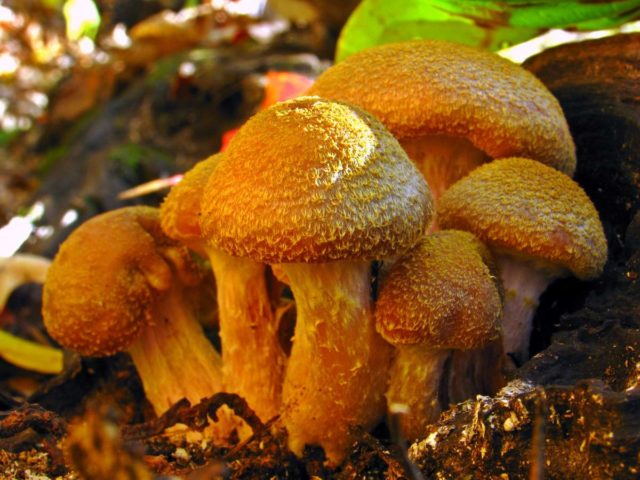 Dalším populárním jedlým druhem medových agarů v Petrohradě je podzimní tlustorohý (latinsky Armillaria lutea), fotografie hub je uvedena níže. Můžete si je vypěstovat sami. Na výšku dosahují plodnice 10 cm, průměr víčka u tohoto druhu je 8–10 cm, jeho tvar je kuželovitý, okraje jsou husté a ohnuté směrem dolů. Celý povrch je pokryt malými šupinami. Barva se pohybuje od hnědé po okrovou. Buničina je pevná s výraznou sýrovou vůní.