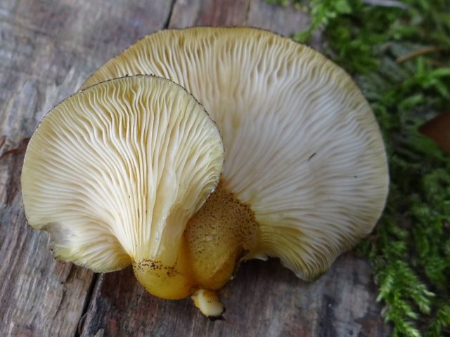 Desky dorůstají ke stonku a sestupují. Často jsou umístěny, rovnoměrně, tenké, různé délky. Mladé houby jsou bledě bílé nebo stříbřité, poté mění barvu na šedavě, špinavě nažloutlé a krémově hnědé odstíny. Mohou mít okrové a jasně žluté tóny. Spórový prášek od bílé po šeřík.