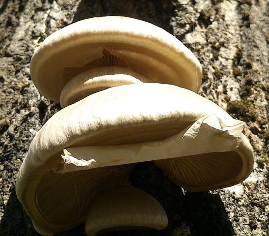 Hlíva ústřičná. Nepoživatelné. Liší se výraznou vůní syrových brambor a přítomností filmového přehozu na širokých talířích.
