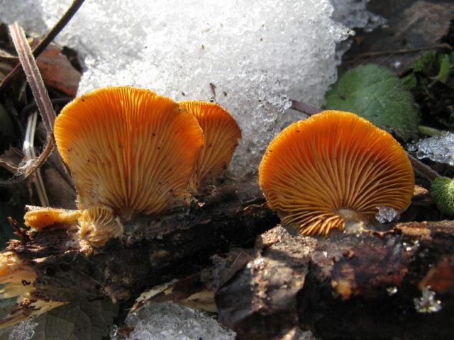 Oranžová hlíva ústřičná. Nejedlé, netoxické. Má červenožlutý pubertální povrch a hnilobný ovocný zápach.