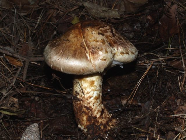 Klobouk matsutake často praskne na okrajích a jeho maso je viditelné.