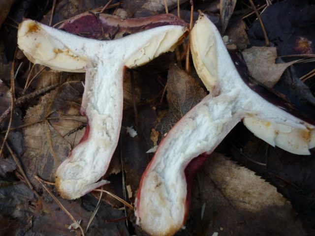 Noha nepoživatelné houby je válcovitá, malovaná v bohaté růžově fialové barvě. Jeho dužina je hustá, hladká, zvenčí mírně pýřitá. Noha je křehká, suchá, na řezu okamžitě zožltne, uvnitř masa je fialová. Průměr nohy - 2 cm, výška - ne více než 3-8 cm.