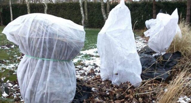 - Mladé keře jsou na zimu pokryty pytlovinou nebo agrofibrem. Dříve byly větve ohnuté k zemi a svázané. Můžete jej jednoduše zakrýt materiálem a upevnit pomocí lana na základně, jak je znázorněno na fotografii.
