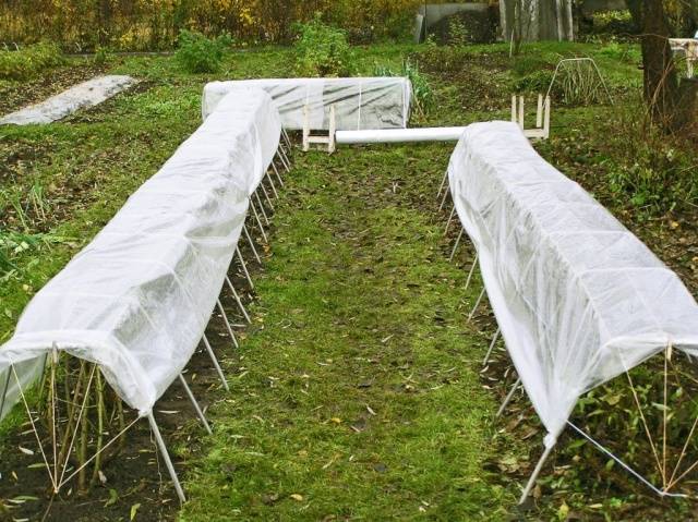 V tomto případě je nutné ohnout větve remontantní maliny, uvázat je na spodní drát a nahoře položit krycí materiál v několika vrstvách, které musí být také upevněny. Pokud žijete v oblasti s drsným podnebím, ale s malým množstvím srážek, pak může být krycí materiál se zbytkovými malinami dodatečně pokryt obloukovým pórovitým polykarbonátem.