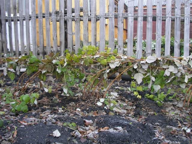 Pokud vaše remontantní malina roste rovnoměrně podél mřížoví, pak by křoví měla být ohnuta jedna na druhou a zároveň upevnit výhonek na dno dalšího křoví drátem. Vzhledem k tomu, že díky mrazu jsou stonky křehčí, ohýbání by se mělo provádět při teplotách nad nulou, těsně před prvními mrazivými dny.