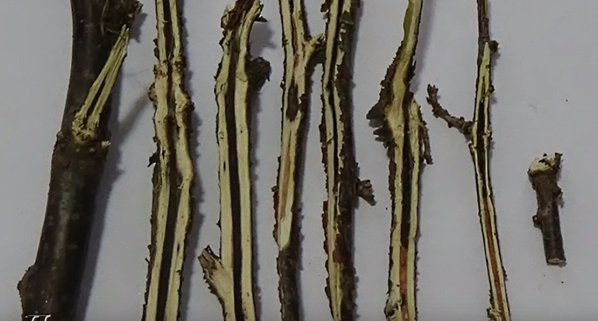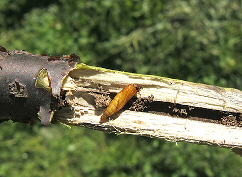 - na podélném řezu poškozené větve je viditelný průchod, částečně naplněný výkaly, a někdy v něm lze najít housenku;