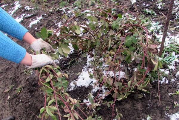 Pro úkryt jsou výhonky po prořezání ohnuty k zemi. S plazivou odrůdou nebudou žádné problémy, ale vztyčený výhled se nehodí k ostrým zatáčkám. Aby nedošlo k rozbití větví rostliny, na podzim po prořezání je na vrcholky vázáno zatížení. Pod tíhou, před nástupem zimy, výhonky postupně padají na zem.