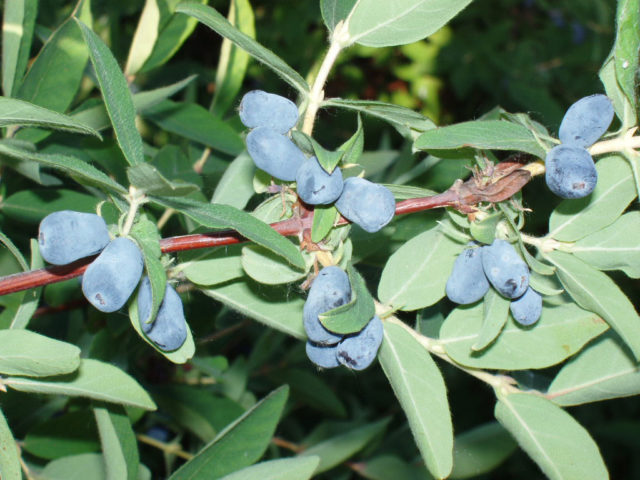 Listy zimolezu odrůdy Lazurnaya jsou velké, oválného tvaru, jak je vidět na fotografii níže. Bobule jsou mírně podlouhlé, uprostřed zesílené. Hmotnost ovoce může dosáhnout 1,5 g. Kůže bobulí je tmavě modrá, na povrchu je namodralý květ. Buničina je jemná, s příjemnou sladkokyselou chutí a vůní borůvek.