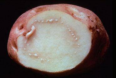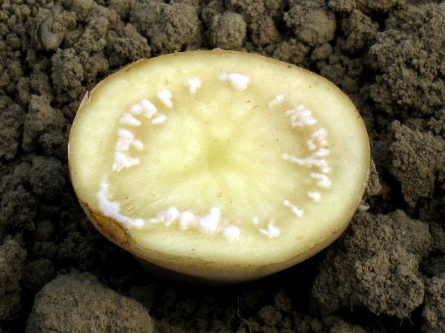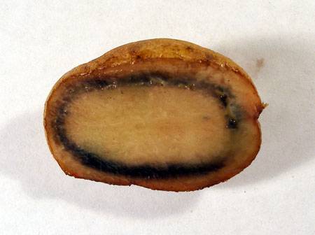 Toto bakteriální onemocnění je rozšířené a každý rok může zabít až 45% plodiny. Onemocnění je charakterizováno latentními příznaky. Na přítomnost onemocnění lze upozornit pouze na 2-3 uschlé stonky brambor. V tomto případě se vnitřní léze vyskytují ve všech vegetativních orgánech rostliny. Na řezu infikovaných listů, když jsou lisovány, můžete vidět kapalinu světle žluté nebo světle hnědé barvy. Taková hnilobná formace obarví žíly listů nažloutlou barvou.