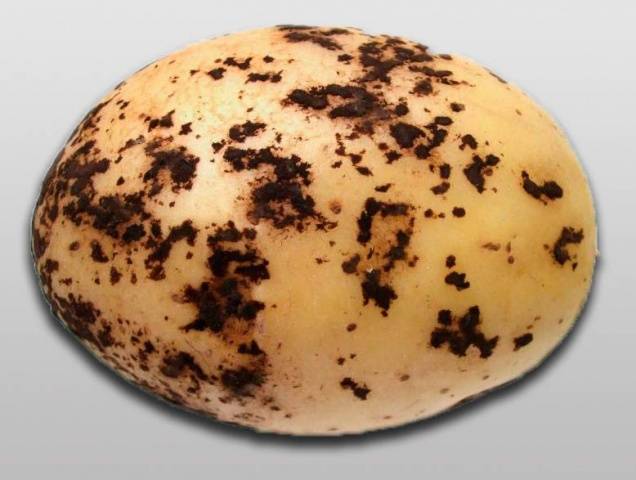 - Stříbrná strup snadno se odliší od všech ostatních typů onemocnění. Objevuje se pouze na hlízách během zimního skladování. Podporuje vývoj teploty houby nad +30C a vlhkost vzduchu nad 90%. V takových podmínkách, blíže k jaru, lze na povrchu uskladněné plodiny pozorovat šedý lesk. Hmotnost těchto hlíz klesá, protože významně ztrácejí vlhkost. Na povrchu brambor se objevují suché propadlé skvrny. Takové anomálie během skladování jsou způsobeny infekcí brambor během kultivace. Příčincem choroby může číhat v půdě nebo na povrchu sadbových brambor.Rozvoju chrastavitosti stříbra můžete zabránit ošetřením brambor fungicidy před jejich skladováním. Po zpracování musí být hlízy dobře sušeny po dobu 3 dnů a poté umístěny do sklepa s určitými vlhkostními a teplotními charakteristikami.