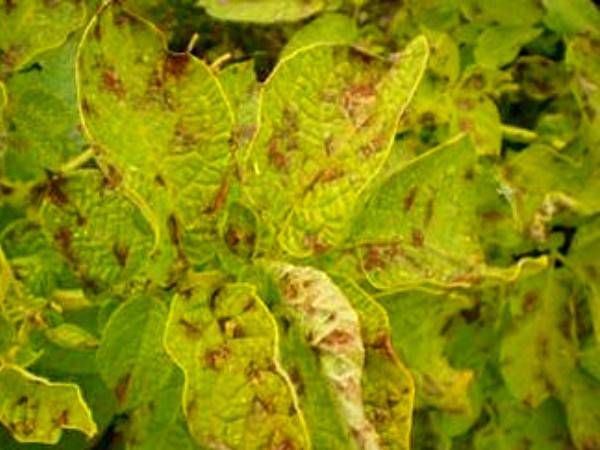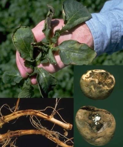 Toto známé plísňové onemocnění je charakteristické nejen pro brambory, ale také pro všechny ostatní plodiny lilku. Jeho prvním znakem je vzhled hnědých skvrn na vnější straně a bílý květ na zadní straně listů rostliny. Pokud nepřijmete vhodná opatření k léčbě pozdní plíseň v rané fázi vývoje onemocnění, pak doslova za měsíc mohou všechny houby trpět všechny bramborové výsadby: listy rostlin zhnědnou, suché, hnědé, husté , na hlízách se objeví hluboce pronikající skvrny. Se zvýšenou vlhkostí vzduchu postižené vrcholy brambor v průběhu času hnijí, během období sucha vadnou a vysychají.