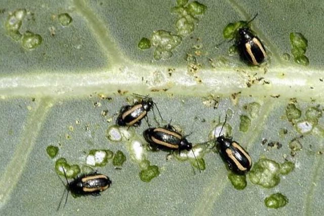 Kruhovití brouci a díry, které zanechávají na zelných listech, jsou jasně viditelné