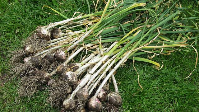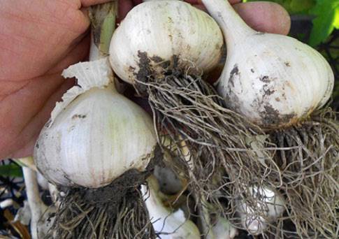 Pokud je počasí velmi horké nebo prší, pak se plodina přenese pod baldachýn, aby ji vysušila. Tento proces je velmi důležitý pro skladování plodin. Aby bylo snazší konzervovat česnek, zkracují se jeho kořeny, přičemž každý z nich ponechává 2 cm a ze stonku zbylo 7-8 cm, takže můžete cibule splétat nebo svazovat do svazku a svazek pověsit na zeď.