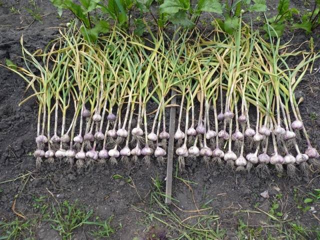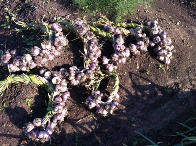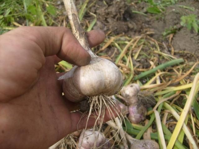 Kořenový systém zeleniny je poměrně rozvinutý, takže je téměř nemožné ji vytáhnout rukama. Můžete jej odstranit z půdy vykopáním lopatou. Pokud zemité hrudky přilnuly k hlavě, je třeba je protřepat. Poté musíte sklizeň zimního česneku dobře vysušit.