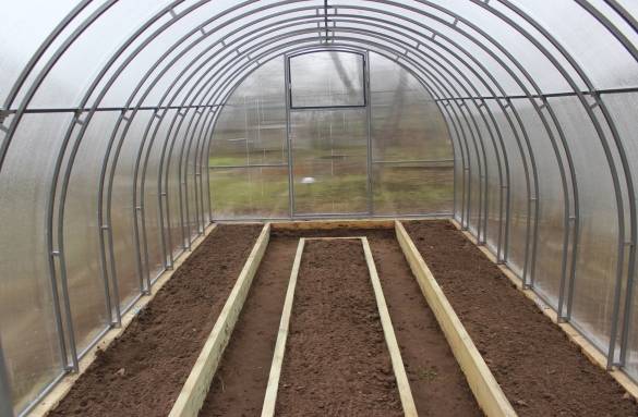 Pokud je váš skleník nový a dosud nebyl rozdělen na postele, musíte to udělat správným způsobem. Na délce postelí nezáleží, mohou být krátké nebo se táhnout po délce celého skleníku. Ale šířka má velký význam. Příliš široké postele jsou nepohodlné pro vodu a bude téměř nemožné se dostat ke vzdáleným rostlinám, aniž byste se dotkli předchozích. Normální šířka zahradní postele bude 80–90 centimetrů. V této vzdálenosti můžete umístit dvě nebo tři řady sazenic, v závislosti na odrůdě a šíření keře. Vzdálenost mezi postelemi by také neměla být příliš široká, je lepší ušetřit místo a zasadit několik dalších řad sazenic. Hlavní věc je, že se můžete pohodlně pohybovat po zahradě.
