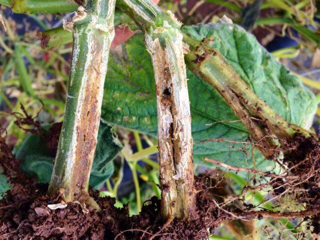 Na kořenech rostlin se objevují tmavé skvrny, stonek se postupně ztenčuje, vysychá, vadne a umírá. Příčinou nemoci je porušení zemědělské technologie a zavlažovacího režimu. Nemoc se šíří velmi rychle, proto jsou při prvním náznaku postižené keře odstraněny a spáleny a půda je ošetřena roztokem bělidla (150 g na 1 m2).