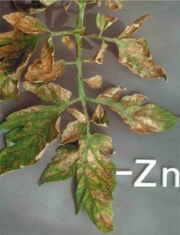 Přebytek zinku okamžitě ovlivňuje staré listy rajčete. Jejich zadní strana je fialová a boční okraje jsou přeloženy do půlkruhu. Nedostatek zinku je určen mladými listy rajčete. Stávají se křehkými a boční okraje jsou ohnuty trubkou směrem k zadní straně listu.