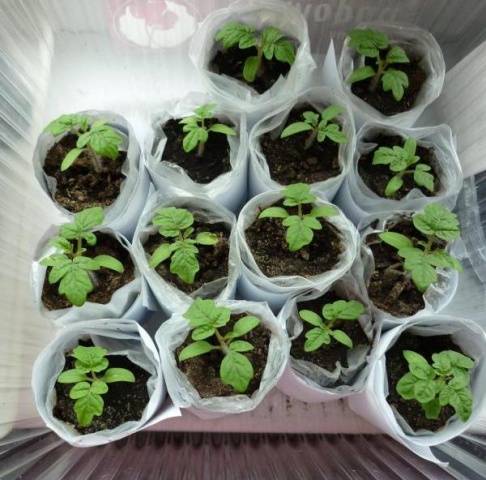 Po objevení prvních dvou skutečných prolamovaných rajčatových listů je čas zasadit vaše drobky do samostatných nádob. Může se jednat o jakékoli plastové nádoby, na jejichž dně je nutné vytvořit otvory pro odtok vody. Pro první transplantaci je lepší vzít malou 0,2-0,3 litrovou nádobu.