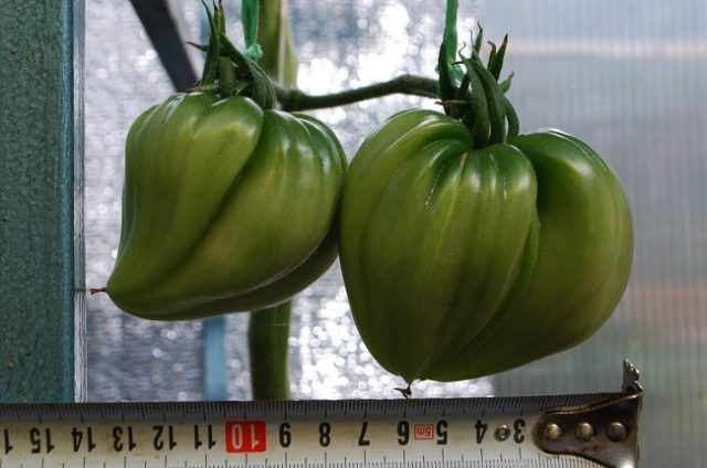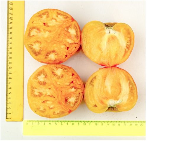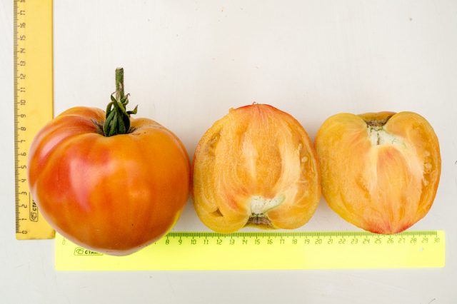 Hmotnost jednoho rajčete může dosáhnout od 250 do 700 gramů. V části nemá stopka zelenou skvrnu, kůže je hustá a lesklá. Zralá rajčata obsahují hodně cukrů. Nažloutlé plody mají dobrou chuť a jsou masité, proto je nejlepší je jíst čerstvé.