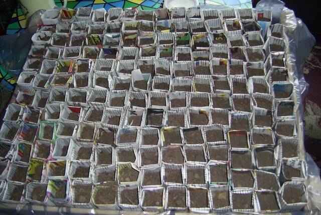 Co když pěstujete sazenice pepře ve velkých objemech (více než 100 keřů) pro sebe a své příbuzné nebo na prodej? Nebo nemáte další prostředky na nákup pilulek, ale máte čas navíc, abyste si se sazenicemi pohrávali. V těchto případech zůstává výběr nádoby na sazenice pepře velmi široký. Jediná věc, kterou si musíte pamatovat, zvláště pokud jste začínající zahradník, je, že pepř opravdu nemá rád narušení kořenového systému, takže je lepší jej okamžitě zasadit do samostatných, i když malých nádob.