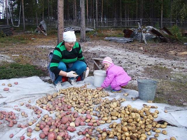 Bramborové hlízy se zpracovávají těsně před výsadbou. Na zemi se rozprostírá plachta nebo velký kus celofánu. Aby nedošlo k jeho odletu, jsou okraje stlačeny dolů.