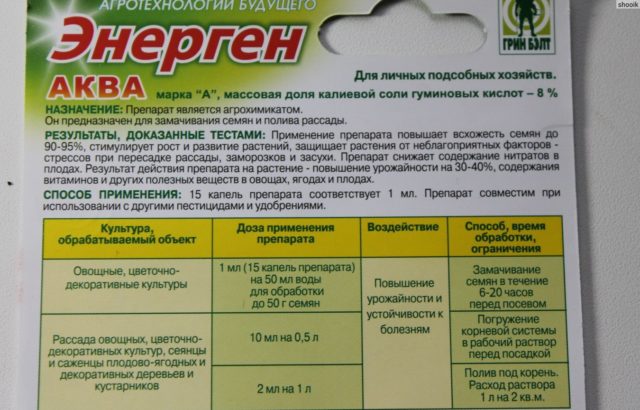 Pokyny k použití tekutého přípravku Energen Aqua a prostředků ve formě kapslí stanoví použití stimulantu pro všechny druhy rostlin v jakékoli fázi vývoje. Doporučuje se ošetřit semena před zasetím a kořenový systém sazenic během jejich umístění na místo. Nástroj zvyšuje produktivitu, odolnost plodin proti infekci, podporuje rychlou vegetaci.