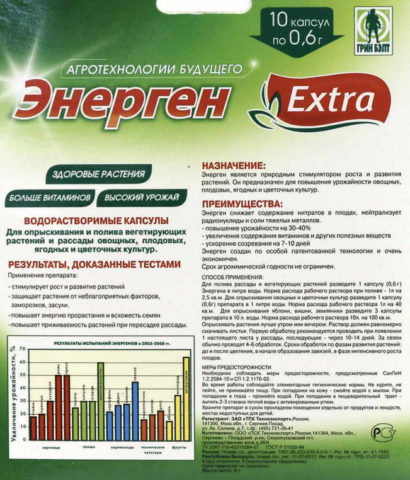 Přírodní růstový stimulant Energen se skládá z přírodních složek, díky nimž je oblíbený mezi zahradníky a zahradníky. Výrobek je šetrný k životnímu prostředí, neškodný pro zvířata, včely a lidi. Zlepšuje složení půdy, obohacuje ji o stopové prvky nezbytné pro rostliny. Užívání drogy aktivuje produkci enzymů, zlepšuje metabolické a chemické procesy. Po krmení kultura dává plný růst, tvoří zelenou hmotu, kvete a přináší ovoce.
