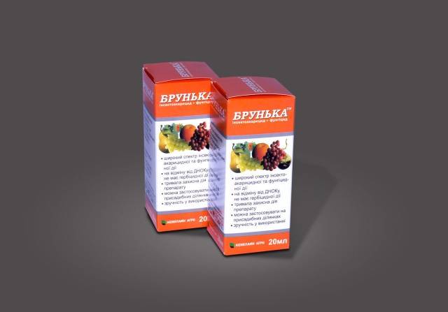 Droga má vlastnosti insekticidu a fungicidu, což z něj činí účinný nástroj pro komplexní ochranu rostlin. Brunka je určena k ošetření ovocných a okrasných stromů a vinic.
