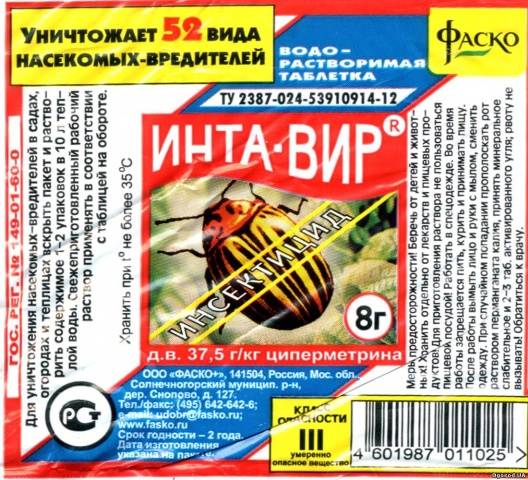 - Intavir... Lék je ve formě tablet, účinný proti bramborovým broukům. Akce nápravy začíná během prvního dne a trvá 2 týdny. Zpracování se provádí postřikem. Je povoleno provádět proceduru dvakrát za sezónu.