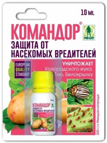 - Velitel... Nízko toxický insekticid, který vám umožní zbavit se škůdců během jejich hromadného šíření. Lék dobře snáší chladu a není spláchnut deštěm. K dosažení požadovaného výsledku stačí jedno ošetření za sezónu.
