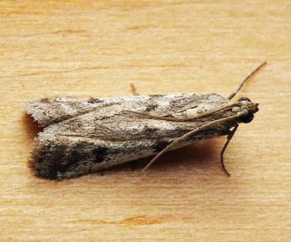 Malý motýl šedý můra s rozpětím křídel až 3 cm, na délku dosahuje ne více než 1,5 cm. Přední křídla jsou tmavě šedé barvy, se světlými pruhy a hnědou skvrnou uprostřed. Druhý pár křídel je lemovaný, světlejší a tmavě lemovaný.
