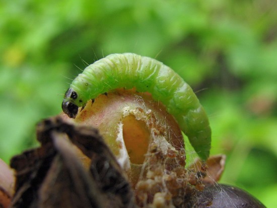 Po nalití pavoučího hnízda a rozdrcení bobulí, které se zdají být neporušené, uvnitř uvidíte poměrně dlouhou housenku o velikosti až 1 cm. Postupně se počet dobrých plodů výrazně sníží a housenky opustí keře , jít dolů na pavučinu. Tento proces lze také vidět pouhým okem.
