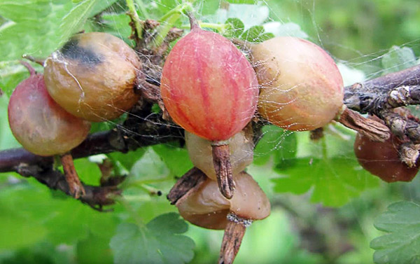 Chcete-li zjistit příčinu poškození bobulí a najít angreštovou můru na keřích, stačí pečlivě prozkoumat větve keřů. Porušení integrity bobulí, přítomnost otvorů ve slupce, jejich zapletení do pavučiny - všechny tyto znaky naznačují, že angrešt byl vystaven škůdcům motýlů.Každý den se počet zkažených plodů zvýší a při absenci včasných ochranných opatření můžete přijít o celou úrodu.