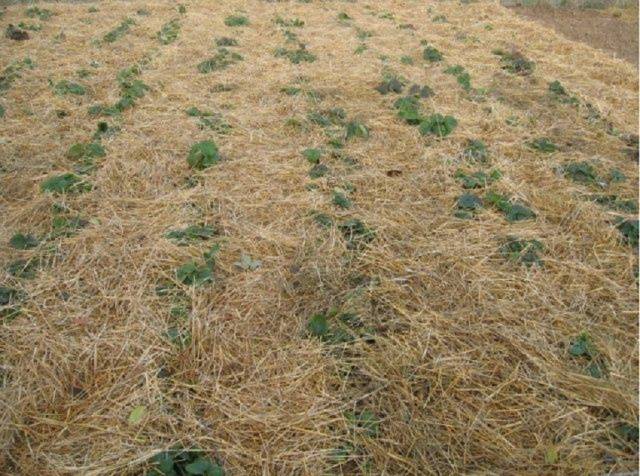 Nezapomeňte narovnat kořeny a posypat keř zeminou. Důležitou podmínkou je, že nemůžete pokropit centrální ledvinu, musí se zvednout nad úroveň země. Rostlina je okamžitě napojena a mulčována. Pro mulčování jahodových hřebenů se používá sláma, suchá posekaná tráva, piliny (dřevo). Tloušťka vrstvy od 5 mm do 10 mm, v závislosti na materiálu.