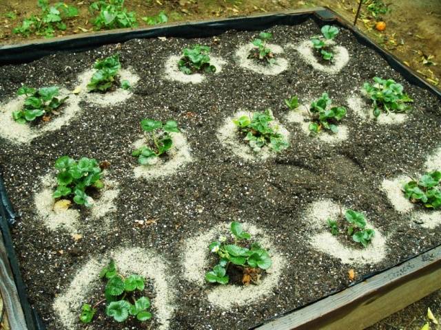 Výsadba se provádí v otvorech oplodněných humusem a popelem s přidáním 1 lžičky. komplexní hnojivo. Studny jsou dobře rozlité vodou - nejméně 1 litr na keř. Hloubka výsadby - spodní úroveň kořenů by měla být 20 cm od úrovně půdy. Nemůžeš usnout srdcem. Rada! Je lepší díru zcela nevyplnit, aby příští rok bylo možné do jahodových rostlin přidat trochu humusu.
