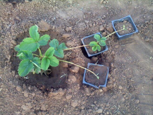 Největší růžice je první z mateřské rostliny. Pokud ale potřebujete rychle množit jahody Brighton, použijte na každý knír druhou. Jakmile se na nich vytvoří kořeny dlouhé asi 1 cm, jsou, aniž by se oddělily od keře, buď „přichyceny“ k půdě, nebo zasazeny do malých nádob, šálků.