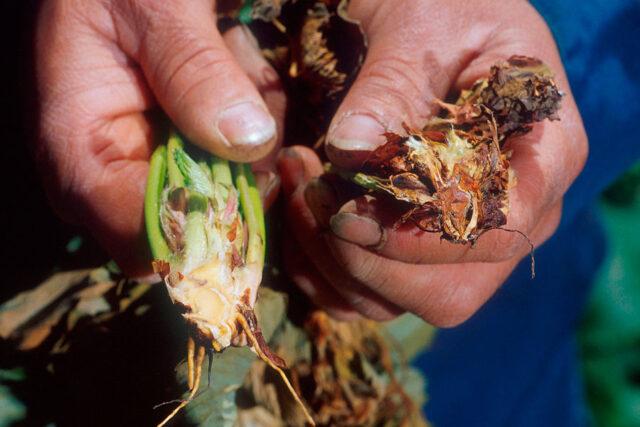Kořenová hniloba na nadzemní části rostliny se projevuje, když proces vývoje onemocnění zachází příliš daleko.
