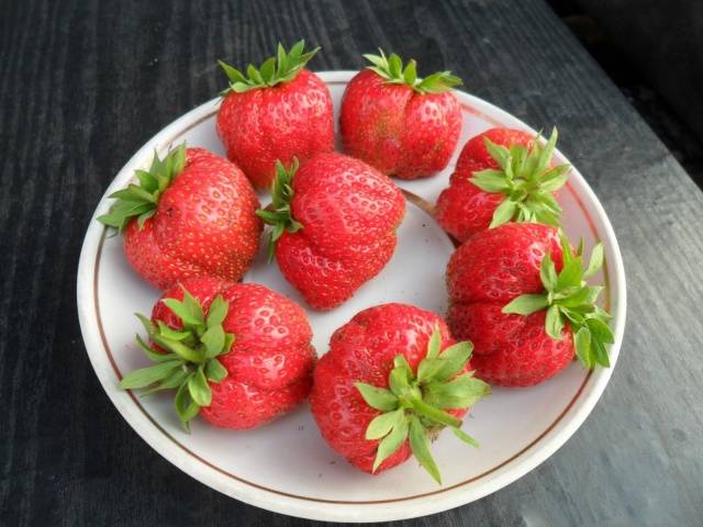 Plody jsou tmavé barvy a kulatého tvaru s výrazným hřebenem. Chutnají sladce, sladce a mají silnou vůni. V posledních fázích sklizně se zvyšuje chuť jahod.