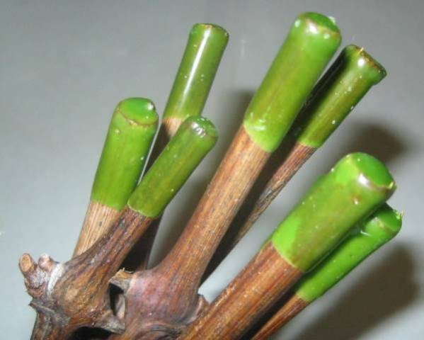 odřízněte výhonky hroznů a ponecháte pouze 2 pupeny. Aby nedošlo k vyschnutí řezu, je ošetřen roztaveným parafínem.
