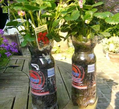Pokud chcete na svém místě pěstovat jahody, pak s nástupem teplých dnů (obvykle v květnu) lze sazenice přenést na místo a umístit lahve, jak vám říká vaše představivost: buď na vertikální podporu, nebo na váhu , nebo umístění na jakýkoli vodorovný povrch.