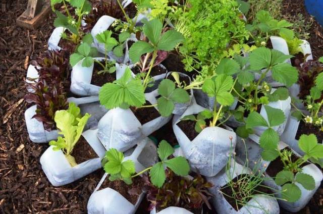 - Za prvé, použití svislých konstrukcí může výrazně zvýšit plochu pro výsadbu jahod. I když vaše plány nezahrnují výstavbu kapitálových struktur z plastových lahví, pak lze nádoby s jahodami jednoduše umístit na jakékoli místo, včetně na betonové a kamenné plochy.