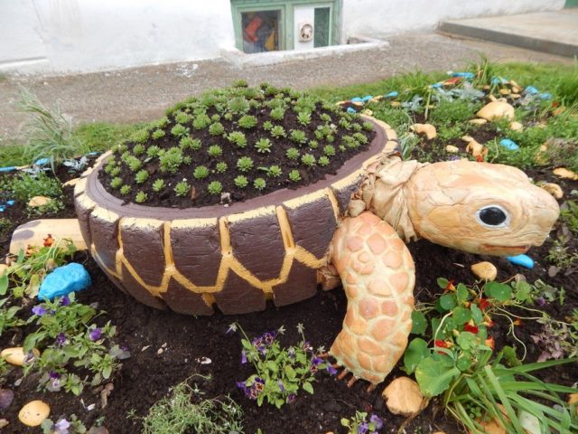 Výroba želvy je docela jednoduchá. K tomu budete potřebovat 2 pneumatiky, do hlavní jsou vyříznuty otvory pro nohy zvířete, z druhé bude vnější část, je rozdělena na 4 segmenty, z nichž se stanou nohy. Za řemesly je konstruován ocas, hlava je vyrobena z plastové láhve.Výrobní proces je ukončen nátěrem.