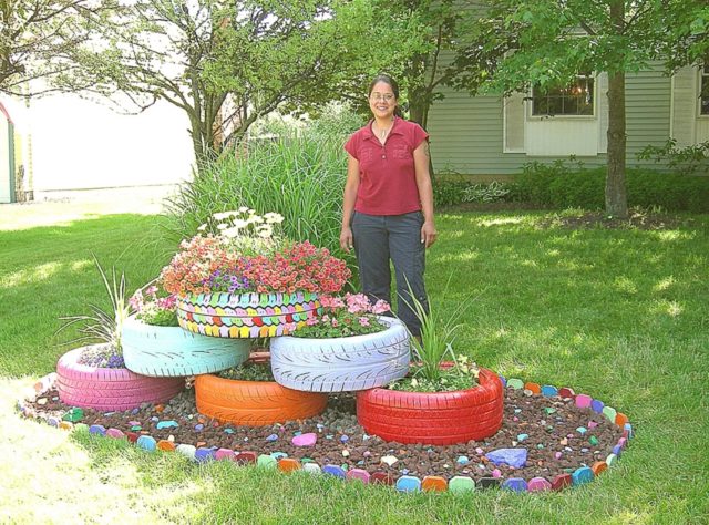 Každý může krásně malovat záhon vytvořený z gumové pneumatiky. Pouze tento proces je kreativní a vyžaduje čas a úsilí. Mezi nejoblíbenější možnosti zdobení květinového záhonu pomocí pneumatik patří výroba květináčů, závěsných květináčů, dekorativních květinových záhonů, různých zástupců fauny: labutě, sloni, papoušci, želvy, ježci, pavouci, květiny (sedmikrásky), prvky kuchyňské náčiní (šálky). Vnější design zahrady nebo dvora bude vypadat originálně, pokud natřete kola na záhon přírodním kamenem.