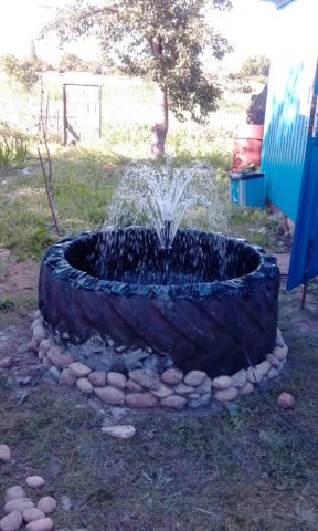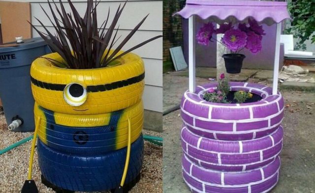 Pro větší originalitu záhonu pneumatik se spolu s pneumatikami používají i jiné improvizované materiály: plastové lahve, různé kameny. Studna z pneumatik bude zdobit zahradní pozemek.