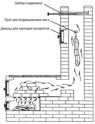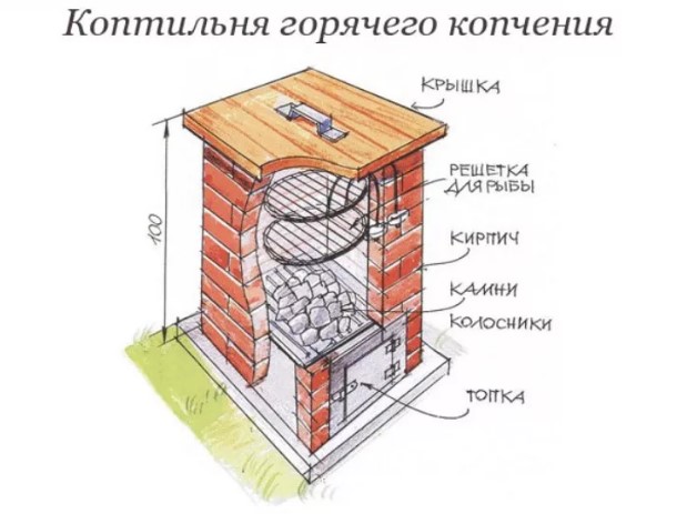 Struktura je považována za jednoduchou. Není třeba vytvářet kanály, vytvářet kouřový generátor. Skládají horkou kouřovou cihlovou udírnu vlastními rukama ve formě malého domu prodlouženého do výšky. V horní části je kovová komora. Výrobky jsou zde zavěšeny. Na dno komory se sypou dřevní štěpky. Ve spodní části udírny je topeniště. Hořící dřevo ohřívá kovové dno komory, piliny začínají doutnat.