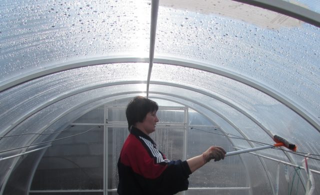 Kartáč je hojně navlhčen hotovým roztokem a stěny, střecha, lamely jsou důkladně umyty. Můžete také dezinfikovat rámy postelí a pokusit se nalít roztok do štěrbin a trhlin. Po dezinfekci se skleník nevypláchne vodou, protože kondenzát skleník sám vyčistí.