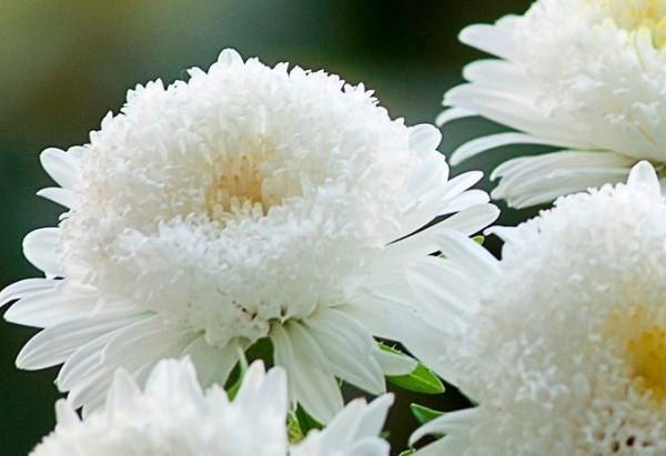 Alba. Asteri s hustými keři vysokými asi 40 cm, dobře listnatí. Listové čepele jsou zelené, podlouhlé. Odrůda je polodvojitá, představovaná sněhově bílými květy (průměr 3 cm) s okvětními lístky připomínajícími ptačí jazyk. Střed žlutých trubkovitých lístků.